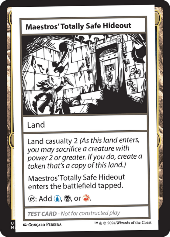 Land casualty 2 (As this land enters, you may sacrifice a creature with power 2 or greater. If you do, create a token that's a copy of this land.) Maestros' Totally Safe Hideout enters the battlefield tapped. {T}: Add {U}, {B}, or {R}.