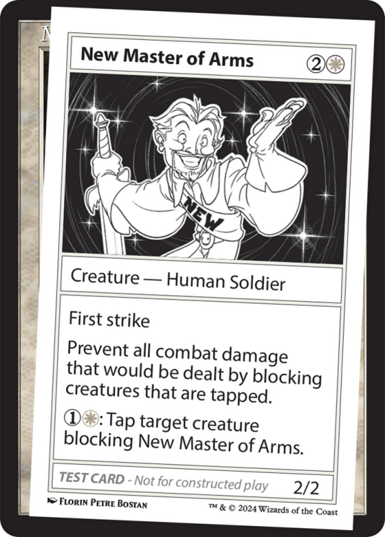First strike Prevent all combat damage that would be dealt by blocking creatures that are tapped. {1}{W}: Tap target creature blocking New Master of Arms.