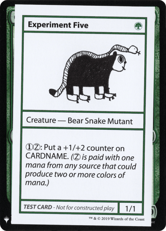 {1}{Z}: Put a +1/+2 counter on Experiment Five. ({Z} is paid with one mana from any source that could produce two or more colors of mana.)