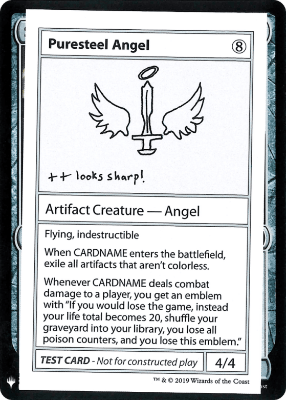 Flying, indestructible When Puresteel Angel enters, exile all artifacts that aren't colorless. Whenever Puresteel Angel deals combat damage to a player, you get an emblem with "If you would lose the game, instead your life total becomes 20, shuffle your graveyard into your library, you lose all poison counters, and you lose this emblem."