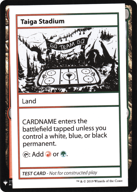 Taiga Stadium enters tapped unless you control a white, blue, or black permanent. {T}: Add {R} or {G}.