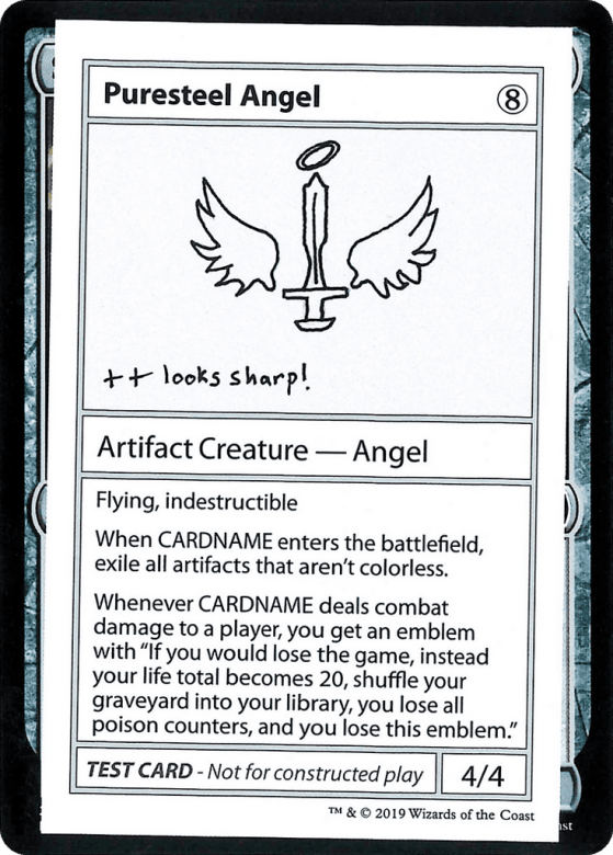 Flying, indestructible When Puresteel Angel enters, exile all artifacts that aren't colorless. Whenever Puresteel Angel deals combat damage to a player, you get an emblem with "If you would lose the game, instead your life total becomes 20, shuffle your graveyard into your library, you lose all poison counters, and you lose this emblem."