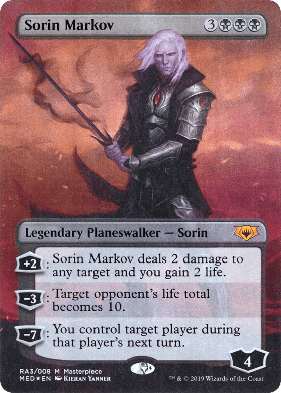 [+2]: Sorin Markov deals 2 damage to any target and you gain 2 life. [−3]: Target opponent's life total becomes 10. [−7]: You control target player during that player's next turn.