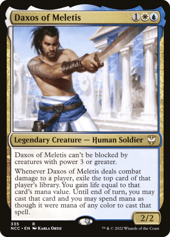 Daxos can't be blocked by creatures with power 3 or greater. Whenever Daxos deals combat damage to a player, exile the top card of that player's library. You gain life equal to that card's mana value. Until end of turn, you may cast that card and you may spend mana as though it were mana of any color to cast that spell.