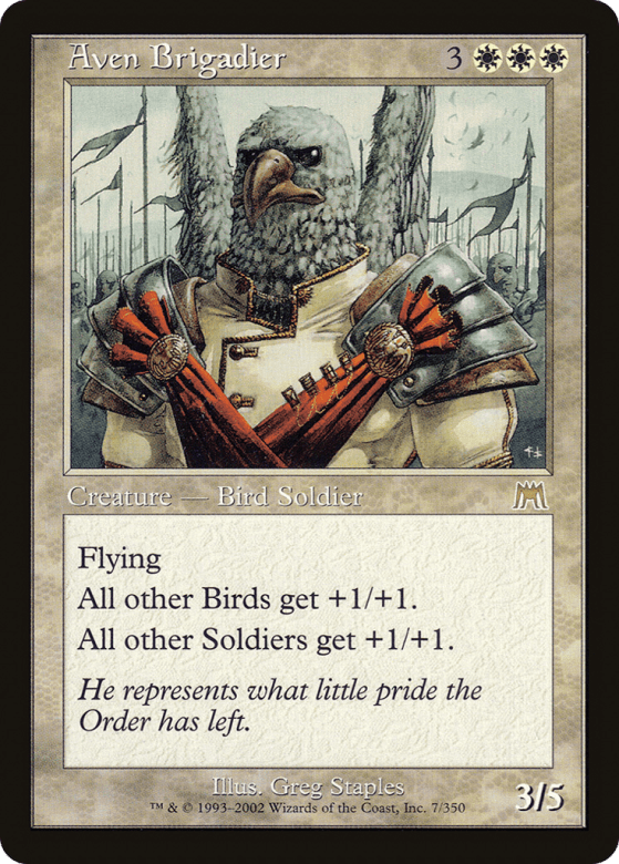 Flying Other Bird creatures get +1/+1. Other Soldier creatures get +1/+1.