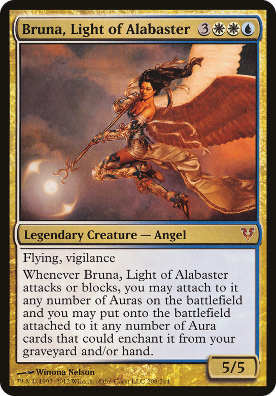 Flying, vigilance Whenever Bruna attacks or blocks, you may attach to it any number of Auras on the battlefield and you may put onto the battlefield attached to it any number of Aura cards that could enchant it from your graveyard and/or hand.