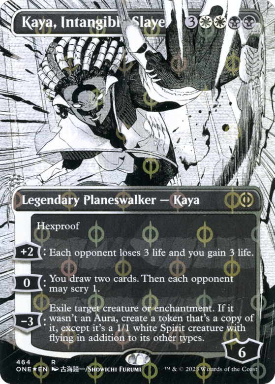 Hexproof [+2]: Each opponent loses 3 life and you gain 3 life. [0]: You draw two cards. Then each opponent may scry 1. [−3]: Exile target creature or enchantment. If it wasn't an Aura, create a token that's a copy of it, except it's a 1/1 white Spirit creature with flying in addition to its other types.