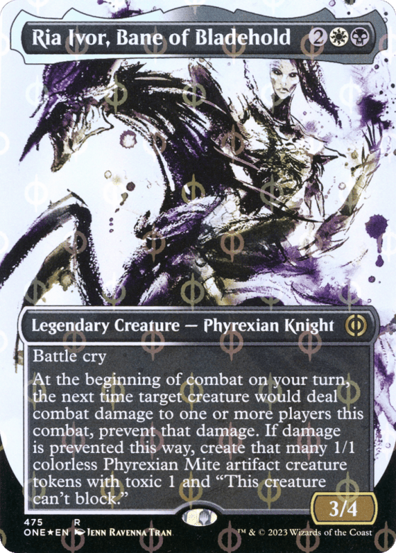 Battle cry (Whenever this creature attacks, each other attacking creature gets +1/+0 until end of turn.) At the beginning of combat on your turn, the next time target creature would deal combat damage to one or more players this combat, prevent that damage. If damage is prevented this way, create that many 1/1 colorless Phyrexian Mite artifact creature tokens with toxic 1 and "This token can't block."