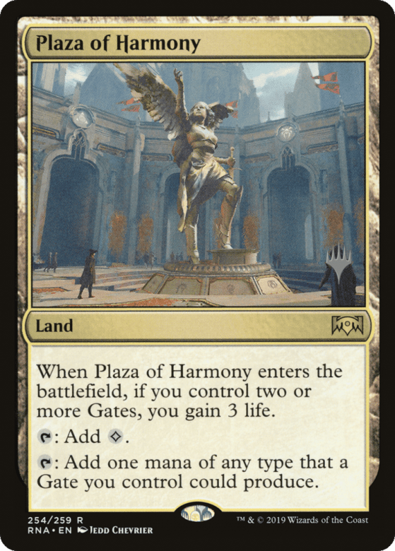 When this land enters, if you control two or more Gates, you gain 3 life. {T}: Add {C}. {T}: Add one mana of any type that a Gate you control could produce.