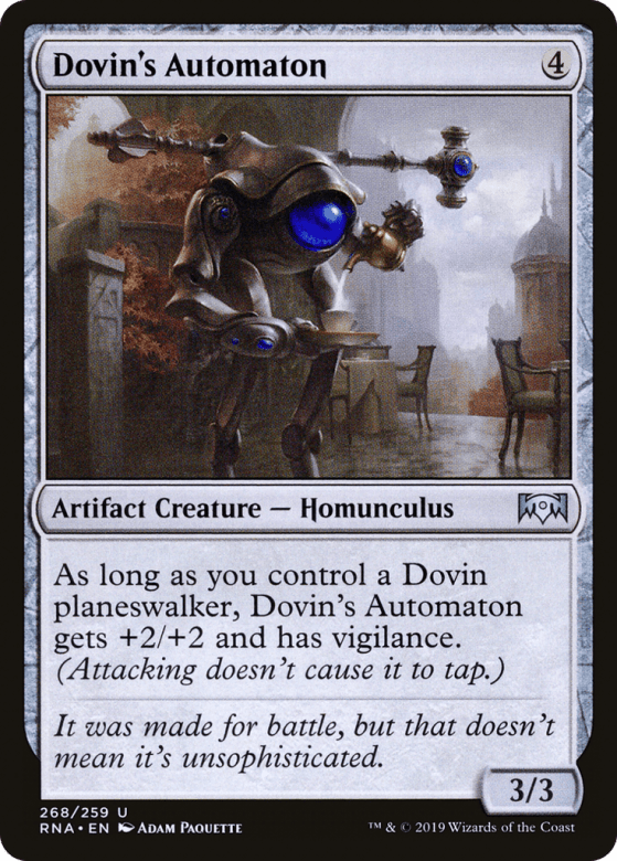 As long as you control a Dovin planeswalker, this creature gets +2/+2 and has vigilance. (Attacking doesn't cause it to tap.)