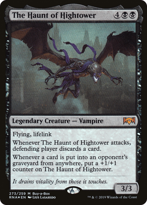 Flying, lifelink Whenever The Haunt of Hightower attacks, defending player discards a card. Whenever a card is put into an opponent's graveyard from anywhere, put a +1/+1 counter on The Haunt of Hightower.