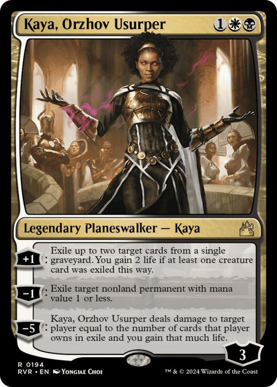 [+1]: Exile up to two target cards from a single graveyard. You gain 2 life if at least one creature card was exiled this way. [−1]: Exile target nonland permanent with mana value 1 or less. [−5]: Kaya deals damage to target player equal to the number of cards that player owns in exile and you gain that much life.