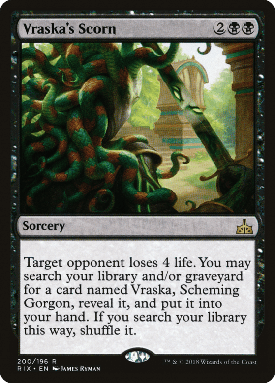Target opponent loses 4 life. You may search your library and/or graveyard for a card named Vraska, Scheming Gorgon, reveal it, and put it into your hand. If you search your library this way, shuffle.