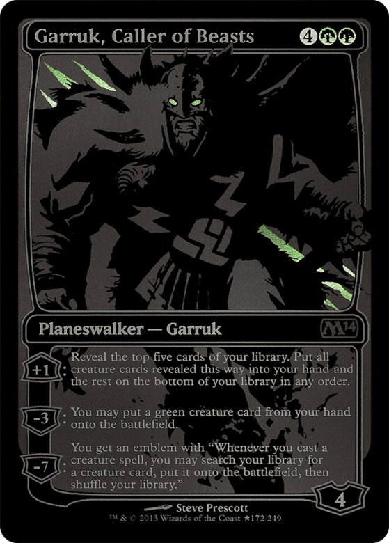 [+1]: Reveal the top five cards of your library. Put all creature cards revealed this way into your hand and the rest on the bottom of your library in any order. [−3]: You may put a green creature card from your hand onto the battlefield. [−7]: You get an emblem with "Whenever you cast a creature spell, you may search your library for a creature card, put it onto the battlefield, then shuffle."