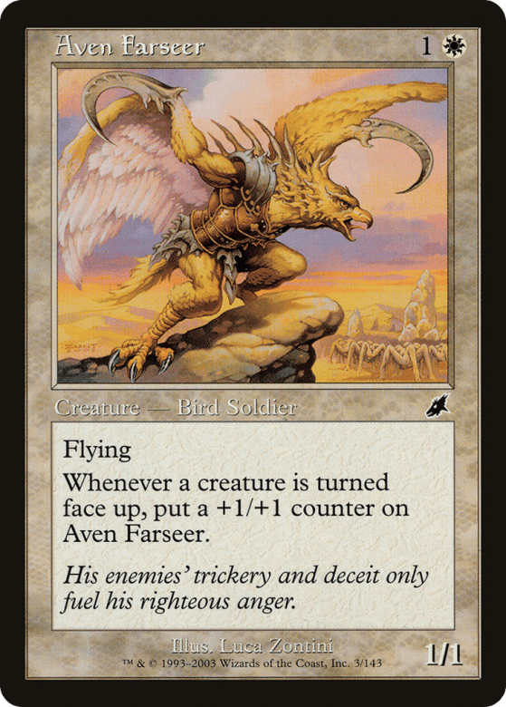 Flying Whenever a permanent is turned face up, put a +1/+1 counter on this creature.