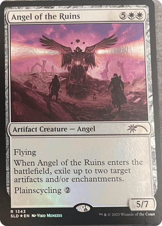 Flying When this creature enters, exile up to two target artifacts and/or enchantments. Plainscycling {2} ({2}, Discard this card: Search your library for a Plains card, reveal it, put it into your hand, then shuffle.)