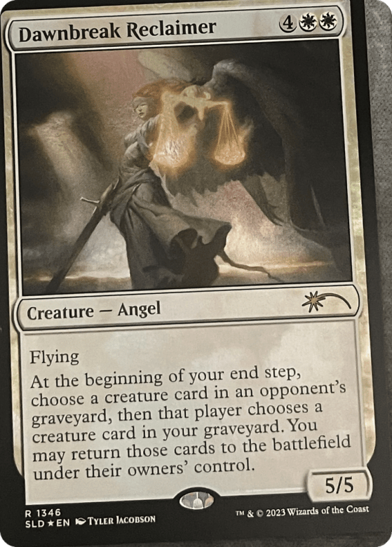 Flying At the beginning of your end step, choose a creature card in an opponent's graveyard, then that player chooses a creature card in your graveyard. You may return those cards to the battlefield under their owners' control.