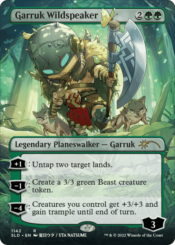 [+1]: Untap two target lands. [−1]: Create a 3/3 green Beast creature token. [−4]: Creatures you control get +3/+3 and gain trample until end of turn.