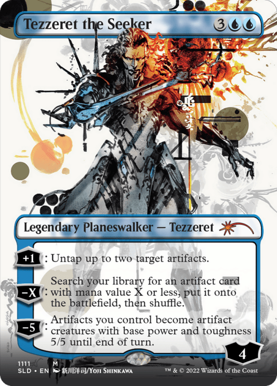 [+1]: Untap up to two target artifacts. [−X]: Search your library for an artifact card with mana value X or less, put it onto the battlefield, then shuffle. [−5]: Artifacts you control become artifact creatures with base power and toughness 5/5 until end of turn.