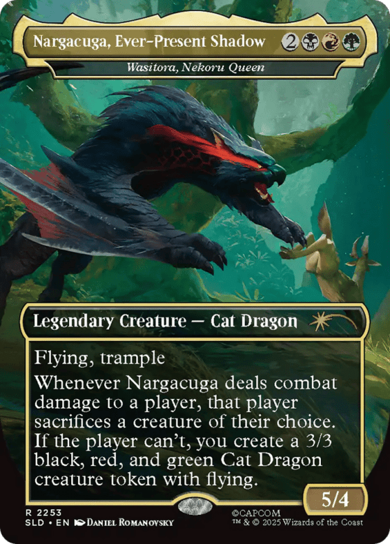 Flying, trample Whenever Wasitora deals combat damage to a player, that player sacrifices a creature of their choice. If the player can't, you create a 3/3 black, red, and green Cat Dragon creature token with flying.