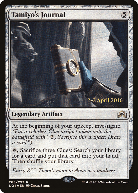 At the beginning of your upkeep, investigate. (Create a Clue token. It's an artifact with "{2}, Sacrifice this token: Draw a card.") {T}, Sacrifice three Clues: Search your library for a card, put that card into your hand, then shuffle.