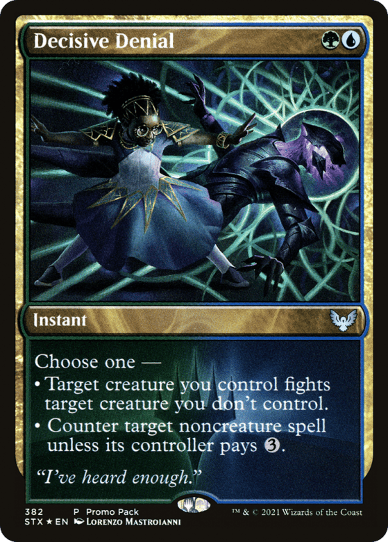 Choose one — • Target creature you control fights target creature you don't control. (Each deals damage equal to its power to the other.) • Counter target noncreature spell unless its controller pays {3}.