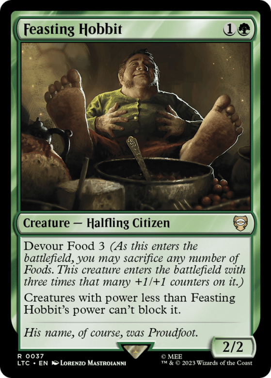 Devour Food 3 (As this creature enters, you may sacrifice any number of Foods. It enters with three times that many +1/+1 counters on it.) Creatures with power less than this creature's power can't block it.