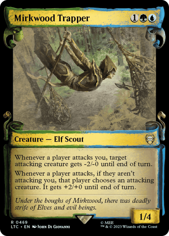 Whenever a player attacks you, target attacking creature gets -2/-0 until end of turn. Whenever a player attacks, if they aren't attacking you, that player chooses an attacking creature. It gets +2/+0 until end of turn.