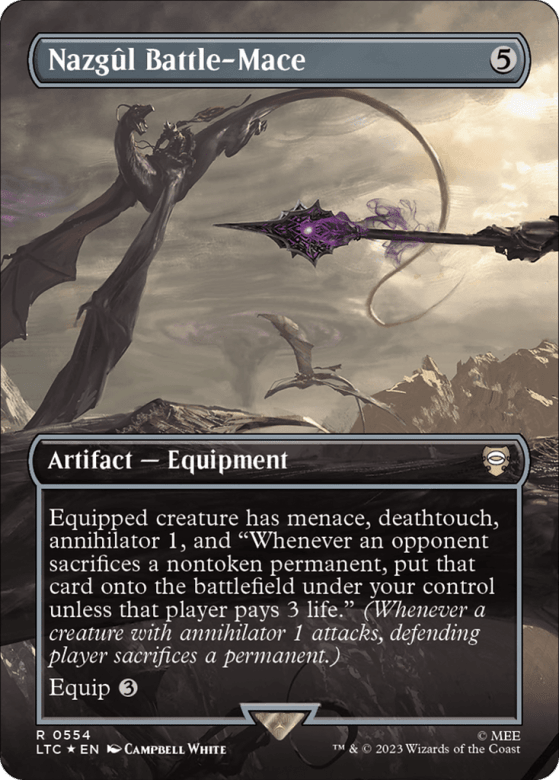 Equipped creature has menace, deathtouch, annihilator 1, and "Whenever an opponent sacrifices a nontoken permanent, put that card onto the battlefield under your control unless that player pays 3 life." (Whenever a creature with annihilator 1 attacks, defending player sacrifices a permanent of their choice.) Equip {3}
