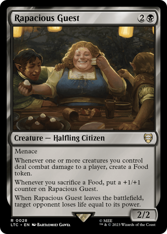 Menace Whenever one or more creatures you control deal combat damage to a player, create a Food token. Whenever you sacrifice a Food, put a +1/+1 counter on this creature. When this creature leaves the battlefield, target opponent loses life equal to its power.