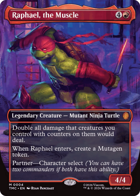 Double all damage that creatures you control with counters on them would deal. When Raphael enters, create a Mutagen token. Partner—Character select (You can have two commanders if both have this ability.)