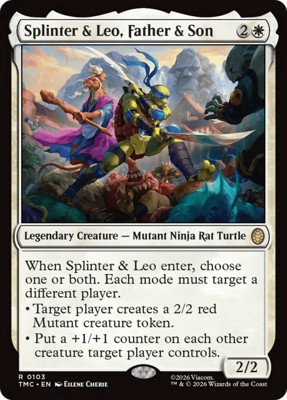When Splinter & Leo enter, choose one or both. Each mode must target a different player. • Target player creates a 2/2 red Mutant creature token. • Put a +1/+1 counter on each other creature target player controls.