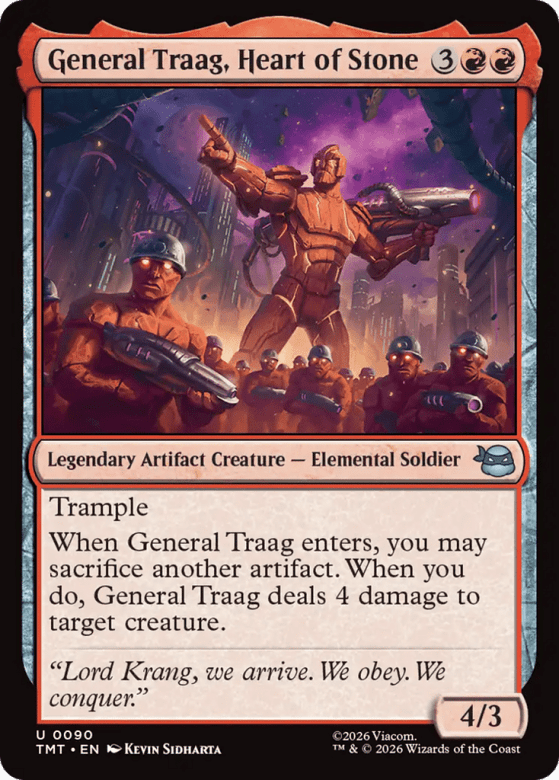 Trample When General Traag enters, you may sacrifice another artifact. When you do, General Traag deals 4 damage to target creature.