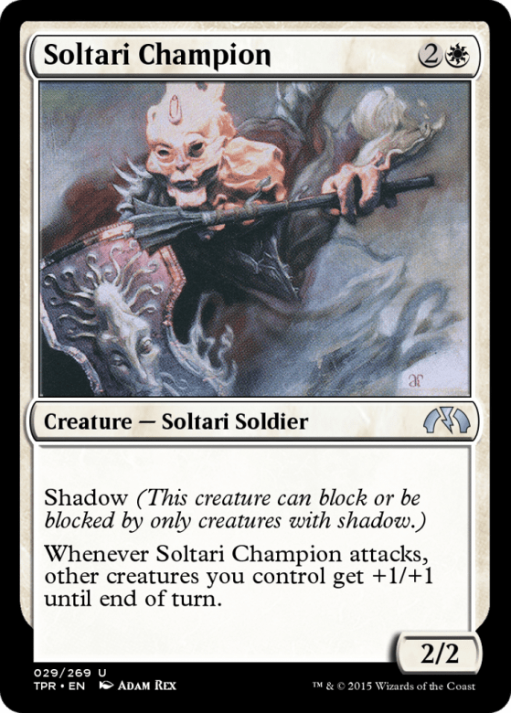 Shadow (This creature can block or be blocked by only creatures with shadow.) Whenever this creature attacks, other creatures you control get +1/+1 until end of turn.