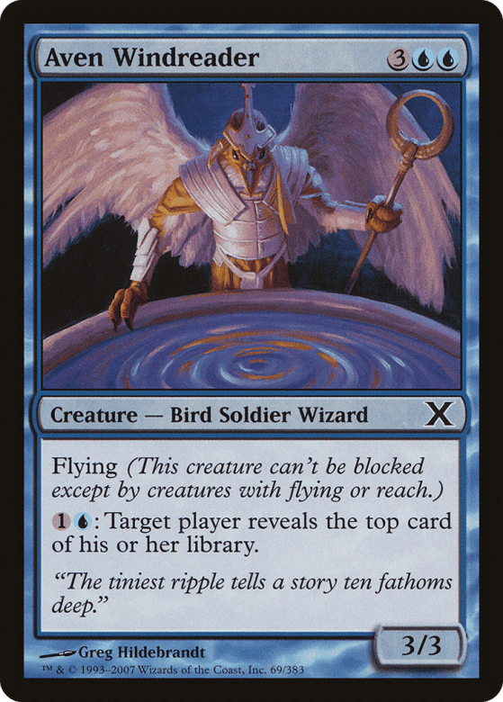 Flying (This creature can't be blocked except by creatures with flying or reach.) {1}{U}: Target player reveals the top card of their library.