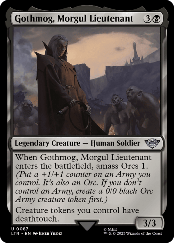 When Gothmog enters, amass Orcs 1. (Put a +1/+1 counter on an Army you control. It's also an Orc. If you don't control an Army, create a 0/0 black Orc Army creature token first.) Creature tokens you control have deathtouch.