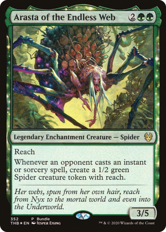 Reach Whenever an opponent casts an instant or sorcery spell, create a 1/2 green Spider creature token with reach.