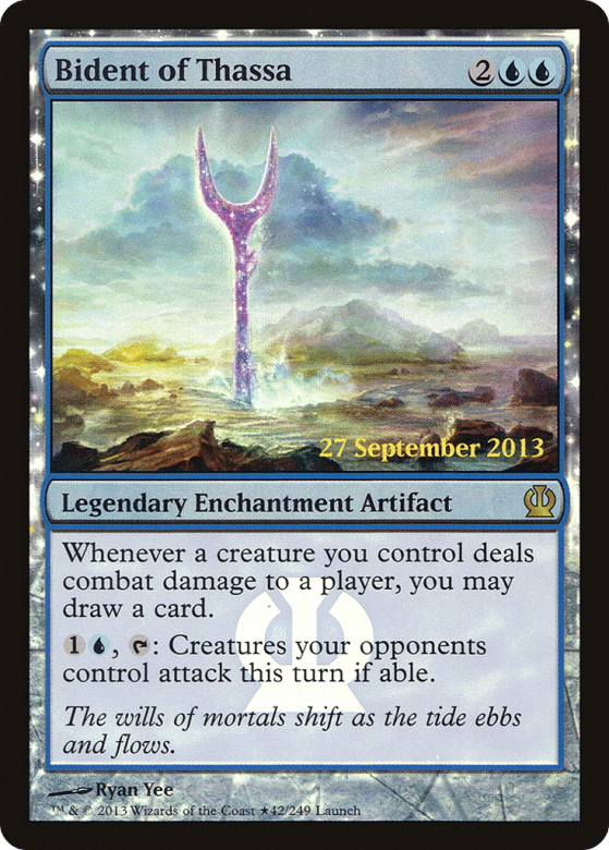 Whenever a creature you control deals combat damage to a player, you may draw a card. {1}{U}, {T}: Creatures your opponents control attack this turn if able.
