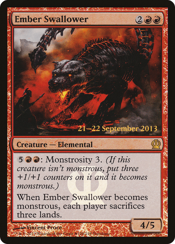 {5}{R}{R}: Monstrosity 3. (If this creature isn't monstrous, put three +1/+1 counters on it and it becomes monstrous.) When this creature becomes monstrous, each player sacrifices three lands of their choice.