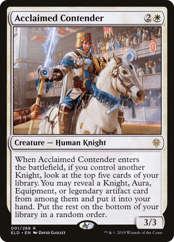 When this creature enters, if you control another Knight, look at the top five cards of your library. You may reveal a Knight, Aura, Equipment, or legendary artifact card from among them and put it into your hand. Put the rest on the bottom of your library in a random order.