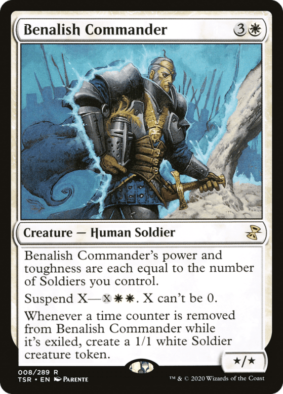 Benalish Commander's power and toughness are each equal to the number of Soldiers you control. Suspend X—{X}{W}{W}. X can't be 0. Whenever a time counter is removed from this card while it's exiled, create a 1/1 white Soldier creature token.