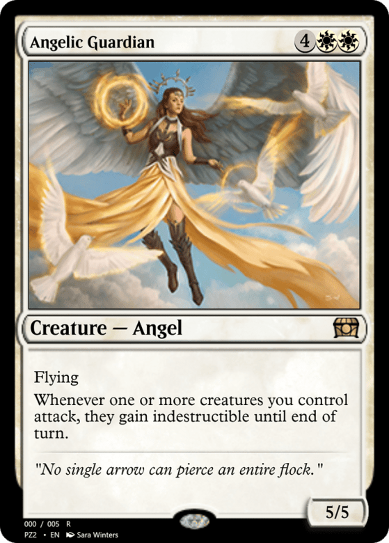 Flying (This creature can't be blocked except by creatures with flying or reach.) Whenever one or more creatures you control attack, they gain indestructible until end of turn. (Damage and effects that say "destroy" don't destroy them.)