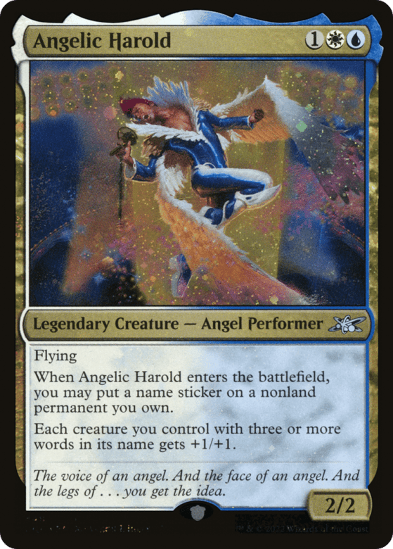 Flying When Angelic Harold enters, you may put a name sticker on a nonland permanent you own. Each creature you control with three or more words in its name gets +1/+1.
