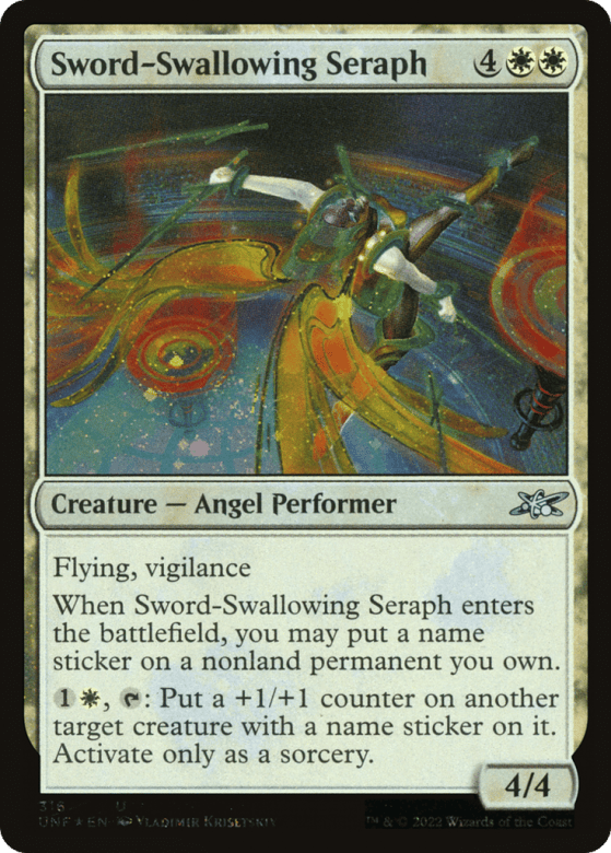 Flying, vigilance When this creature enters, you may put a name sticker on a nonland permanent you own. {1}{W}, {T}: Put a +1/+1 counter on another target creature with a name sticker on it. Activate only as a sorcery.