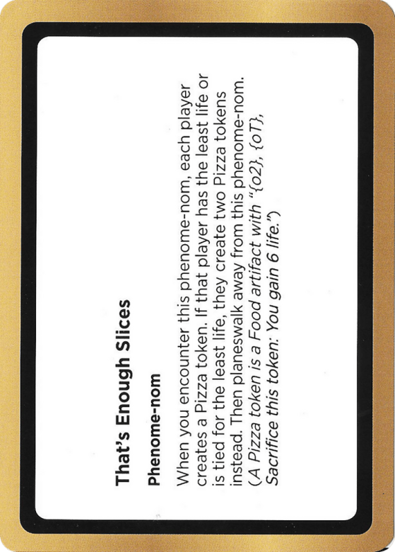 When you encounter this phenome-nom, each player creates a Pizza token. If that player has the least life or is tied for the least life, they create two Pizza tokens instead. Then planeswalk away from this phenome-nom. (A Pizza token is a Food artifact with "{02}, {oT}, Sacrifice this token: You gain 6 life.")