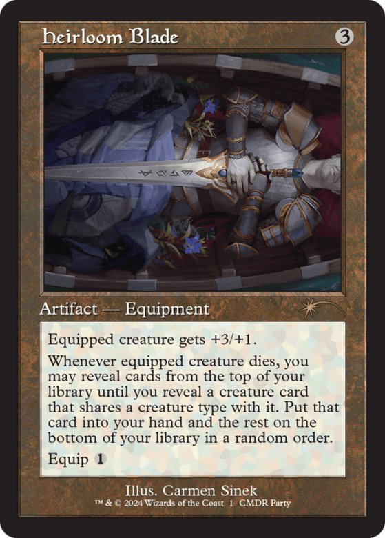 Equipped creature gets +3/+1. Whenever equipped creature dies, you may reveal cards from the top of your library until you reveal a creature card that shares a creature type with it. Put that card into your hand and the rest on the bottom of your library in a random order. Equip {1}