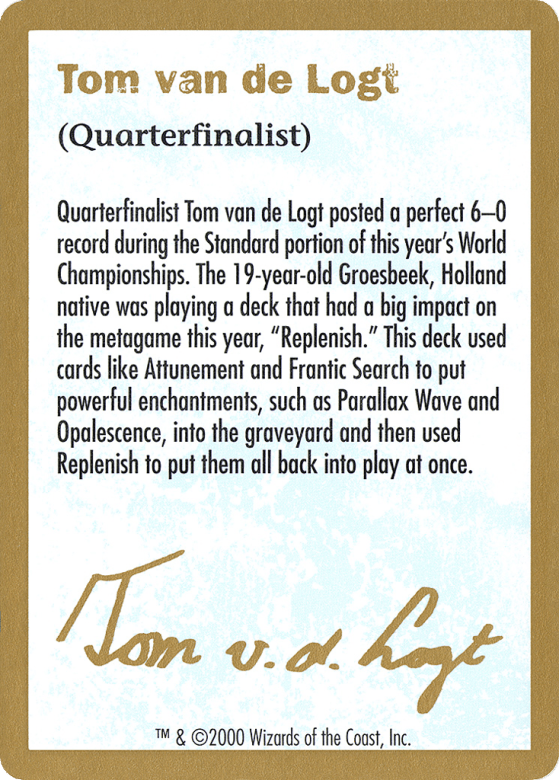 Quarterfinalist Tom van de Logt posted a perfect 6—0 record during the Standard portion of this year's World Championships. The 19-year-old Groesbeek, Holland native was playing a deck that had a big impact on the metagame this year, "Replenish." This deck used cards like Attunement and Frantic Search to put powerful enchantments, such as Parallax Wave and Opalescence, into the graveyard and then used Replenish to put them all back into play at once.