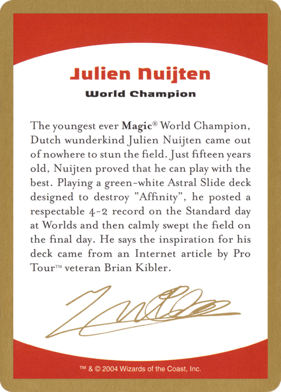 The youngest ever Magic® World Champion, Dutch wunderkind Julien Nuijten came out of nowhere to stun the field. Just fifteen years old, Nuijten proved that he can play with the best. Playing a green—white Astral Slide deck designed to destroy "Affinity", he posted a respectable 4-2 record on the Standard day at Worlds and then calmly swept the field on the final day. He says the inspiration for his deck came from an Internet article by Pro Tour™ veteran Brian Kibler.