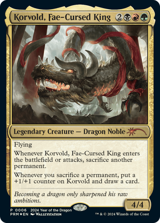 Flying Whenever Korvold enters or attacks, sacrifice another permanent. Whenever you sacrifice a permanent, put a +1/+1 counter on Korvold and draw a card.