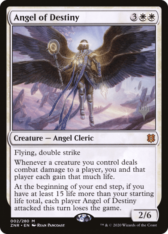 Flying, double strike Whenever a creature you control deals combat damage to a player, you and that player each gain that much life. At the beginning of your end step, if you have at least 15 life more than your starting life total, each player this creature attacked this turn loses the game.